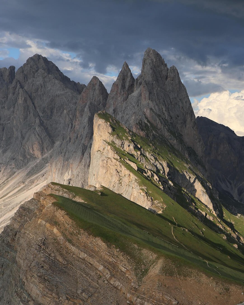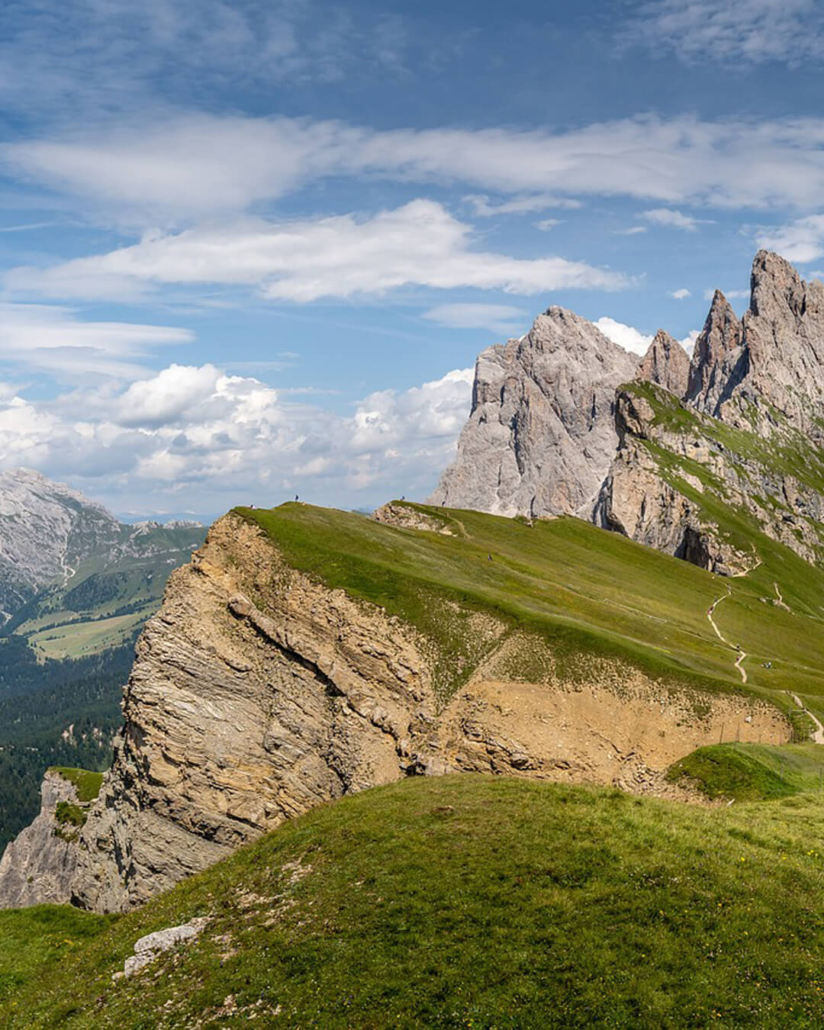 Ein Naturwunder: Ein scharfer Grat, der steil in die Tiefe fällt. Der Blick zählt zu den surrealsten der Dolomiten. Die Seceda-Gratlinie gehört zu den spektakulärsten Aussichten der Dolomiten und liegt ebenfalls im Grödnertal. Ausgangspunkte sind die Orte St. Ulrich (Ortisei) und St. Christina, von wo aus moderne Seilbahnen Besucher direkt auf die Höhen bringen. Von oben eröffnet sich ein Panorama aus steilen Graten, saftig-grünen Almwiesen und den ikonischen Dolomitenspitzern – ein Highlight für Wanderer, Fotografen und Adrenalinfreunde. Die Seceda-Gratlinie eignet sich sowohl für entspannte Tagesausflüge als auch für anspruchsvolle Bergtouren.